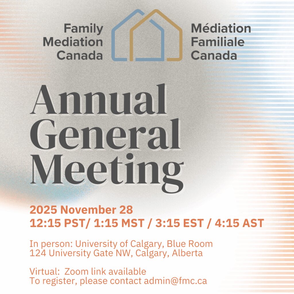 Family Mediation Canada invites all members, partners, and sector stakeholders to join us for our Annual General Meeting — a chance to reflect on this year’s milestones, celebrate our collective progress, and look ahead to the future.